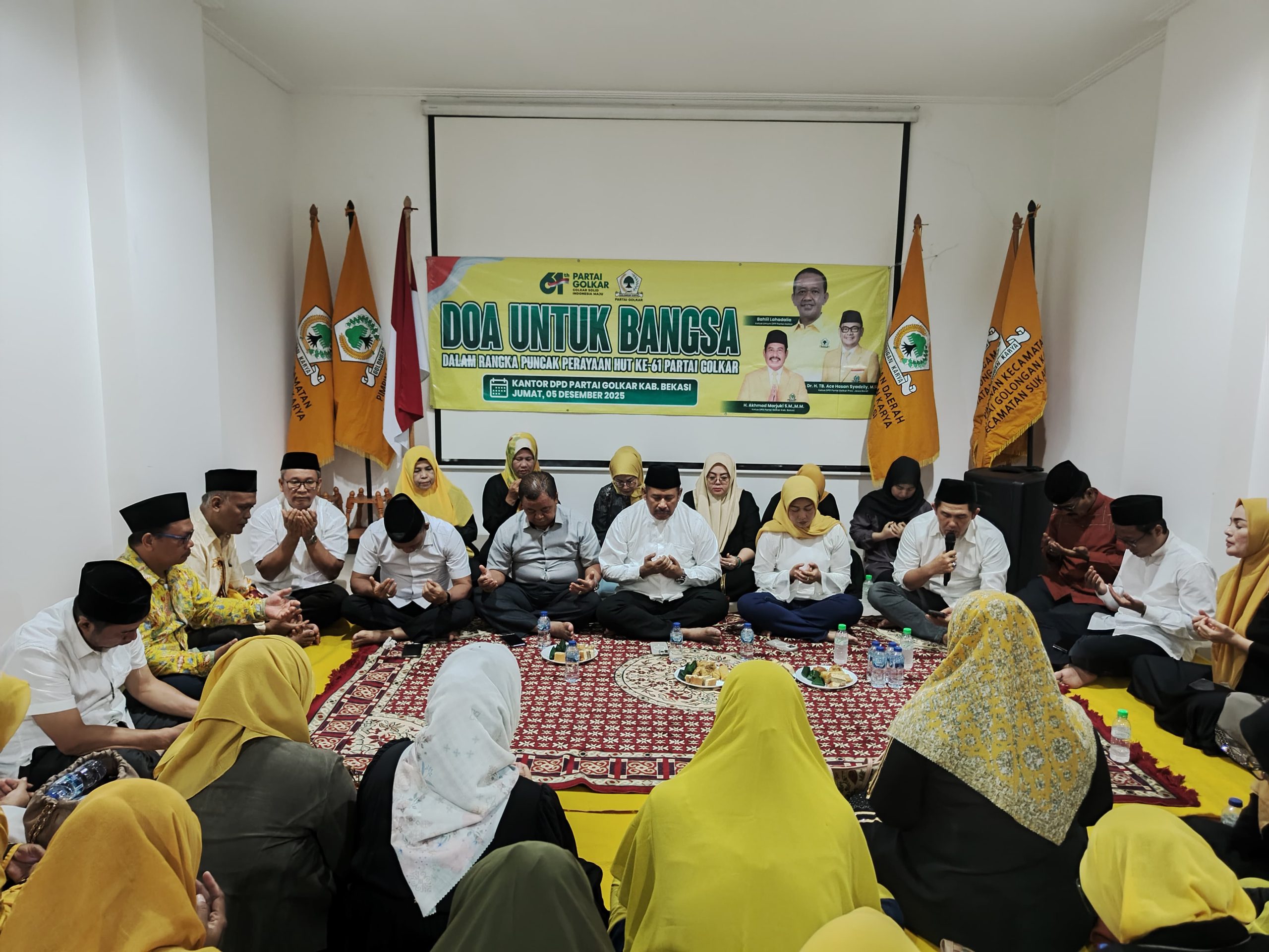 DETIKSR.ID Bekasi — Dalam suasana penuh kekhusyukan, DPD Partai Golkar Kabupaten Bekasi menggelar Doa untuk Bangsa di kantor DPD setempat, sebagai bagian dari puncak peringatan Hari Ulang Tahun (HUT) Partai Golkar ke-61. Kegiatan ini menjadi ruang perenungan sekaligus bentuk empati terhadap saudara-saudara sebangsa yang tengah tertimpa musibah di berbagai wilayah Indonesia.