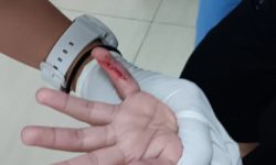Menurut keterangan YT, sang anak terjatuh dan mengalami luka cukup parah di bagian kepala serta jari kelingking yang mengeluarkan banyak darah.