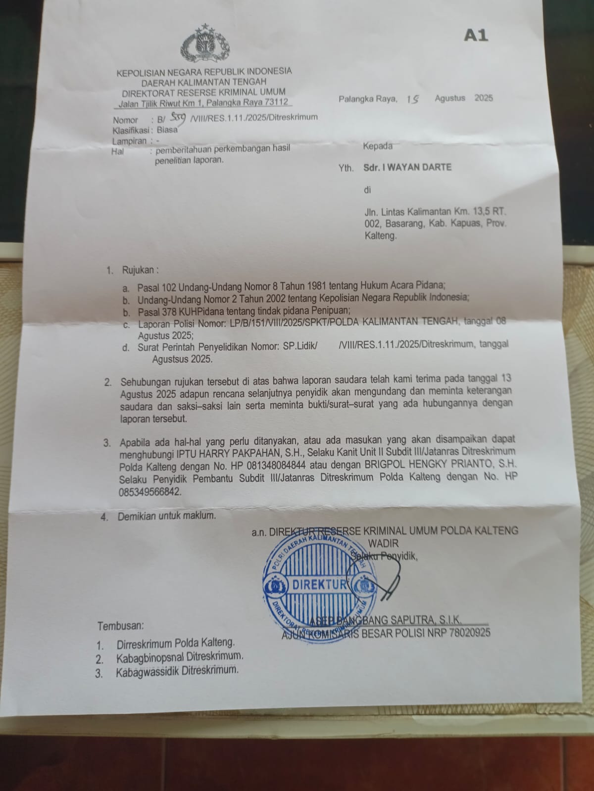 DetikSR.id JAKARTA – Angga Susanto kini resmi dilaporkan oleh I Wayan Darte di Polda Kalimantan Tengah setelah sebelumnya telah dimintai secara baik-baik untuk mengembalikan uang miliknya.