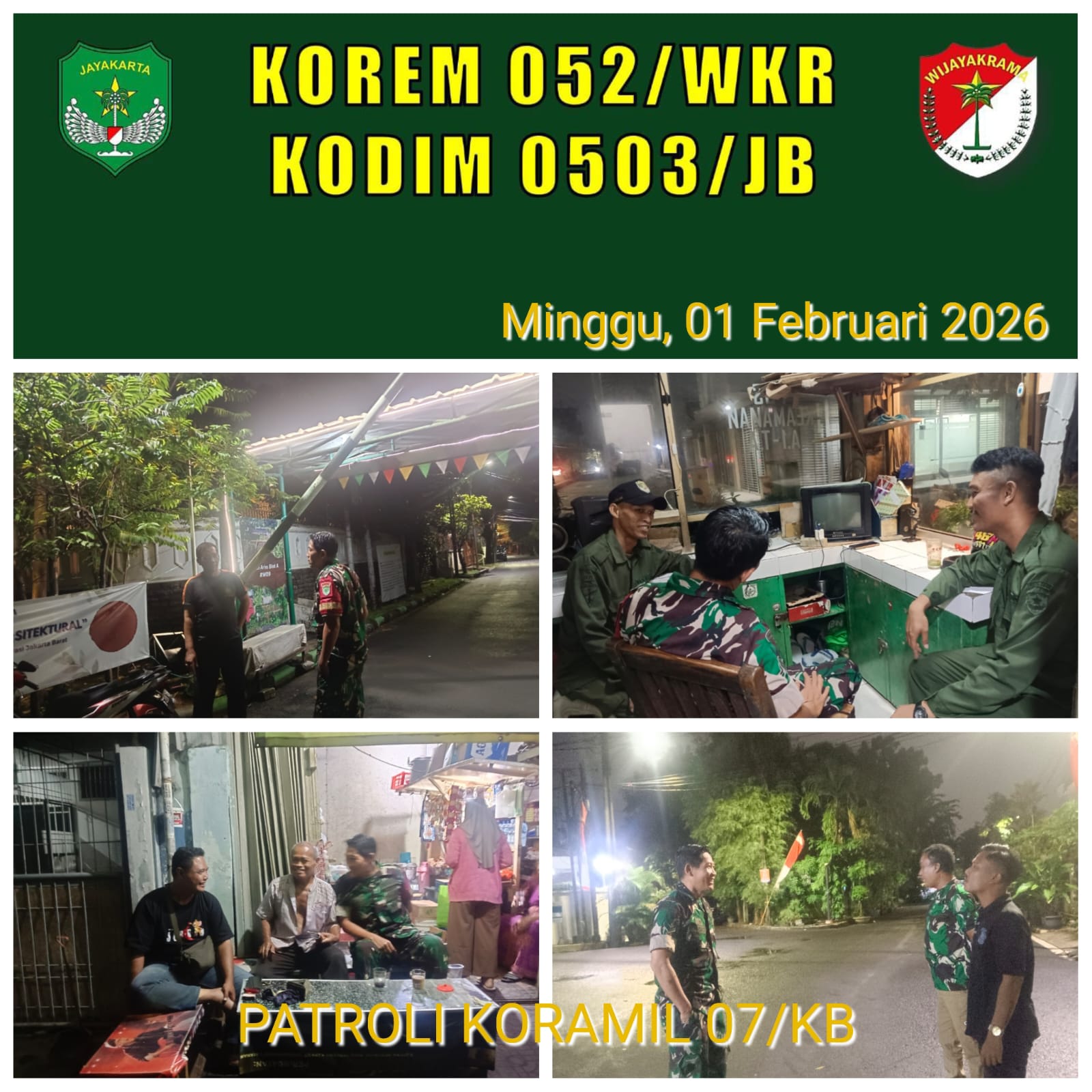 DetikSR.id Kodam Jaya Jakarta – Ciptakan kondusifitas wilayah, Babinsa Koramil 07/Kembangan Sertu Agus Toni bersama komponen pendukung (Komduk) melaksanakan patroli keamanan dalam Rangka antisipasi Tawuran, Gank Motor, Balapan liar dan Kejahatan Minggu 1 Februari 2026 dini hari.