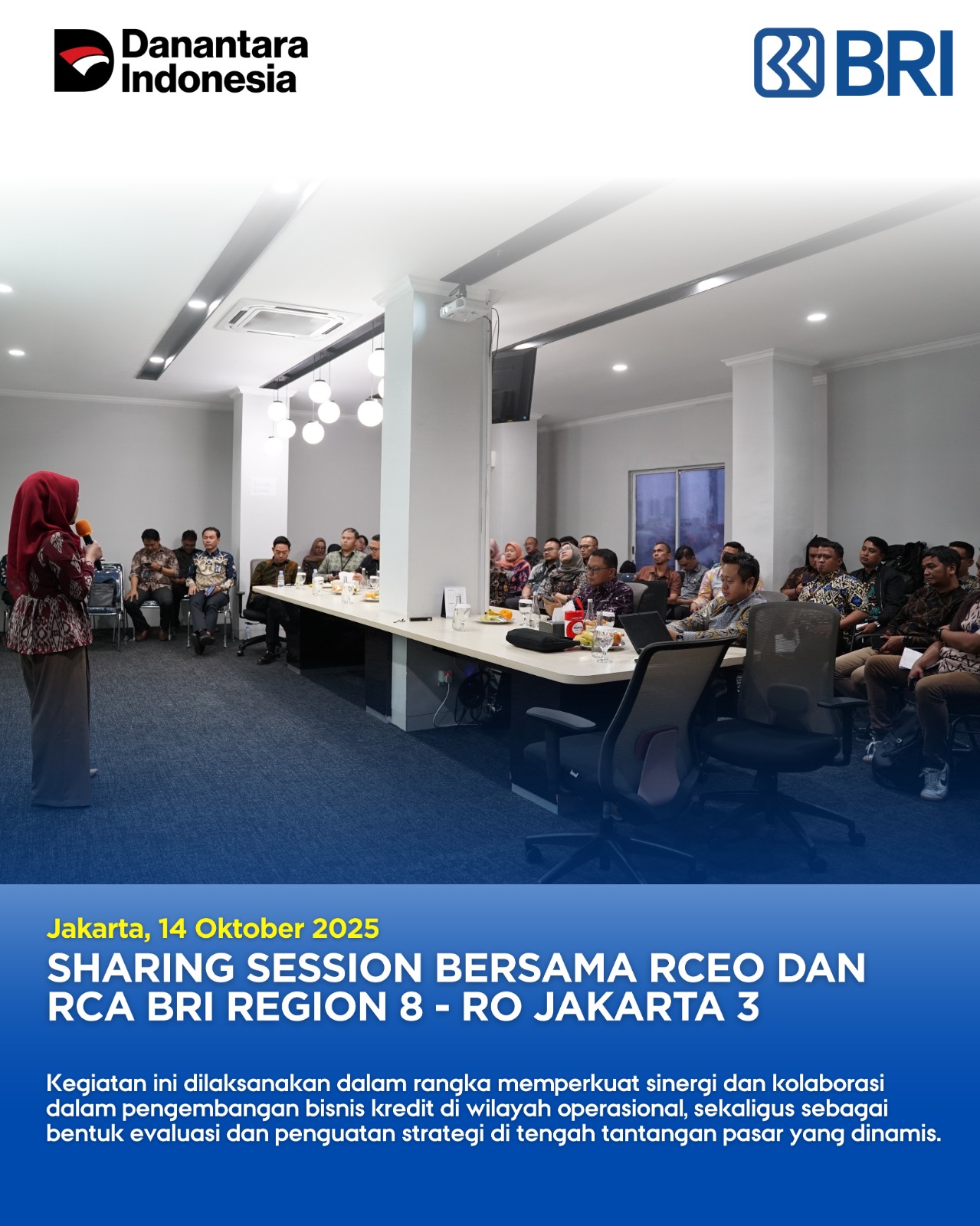 DetikSR.id Jakarta, 14 Oktober 2025 – Bank Rakyat Indonesia (BRI) Regional Office (RO) Jakarta 3 menggelar kegiatan Sharing Session bersama Regional Chief Executive Officer (RCEO) dan Regional Credit Analyst (RCA) BRI Region 8. Acara ini dihadiri oleh para pemimpin cabang, termasuk Adi Sujarwanto, Pemimpin Cabang BRI, serta jajaran pimpinan unit kerja di wilayah operasional Jakarta.