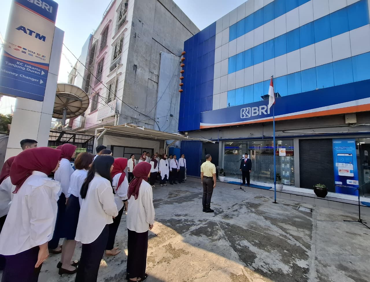 Upacara dilaksanakan dengan khidmat, dipimpin langsung oleh Pemimpin Cabang BRI Tanjung Duren, Tri Ichsan Nur, dan dihadiri seluruh jajaran pekerja serta petugas keamanan.