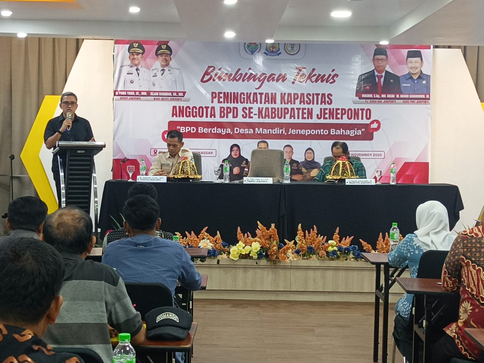 DetikSR.id Makassar — Bupati Jeneponto H. Paris Yasir, SE, MM menghadiri kegiatan Bimbingan Teknis (Bimtek) Peningkatan Kapasitas Anggota Badan Permusyawaratan Desa (BPD) se-Kabupaten Jeneponto yang berlangsung di Hotel Royalbay Splash Music, Makassar, pada Jumat, 7 November 2025.