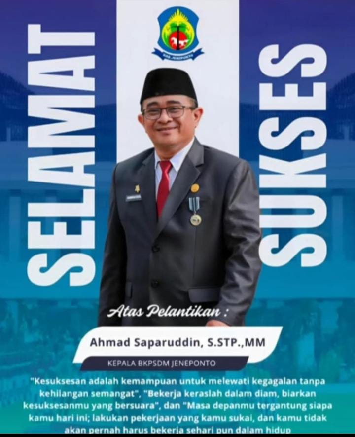 DetikSR.id Jeneponto 1 Oktober 2025 – Pemerintah Kabupaten Jeneponto resmi melantik Ahmad Saparuddin, S.STP., MM sebagai Kepala Badan Kepegawaian dan Pengembangan Sumber Daya Manusia (BKPSDM) Jeneponto.