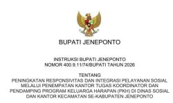 DetikSR.id Jeneponto — Bupati Jeneponto, H. Paris Yasir, SE, MM, resmi mengeluarkan Instruksi Bupati Jeneponto Nomor 400.9.11/74/Bupati Tahun 2026 tentang Peningkatan Responsivitas dan Integrasi Pelayanan Sosial melalui Penempatan Kantor Tugas Koordinator dan Pendamping Program Keluarga Harapan (PKH) di Dinas Sosial dan Kantor Kecamatan se-Kabupaten Jeneponto.