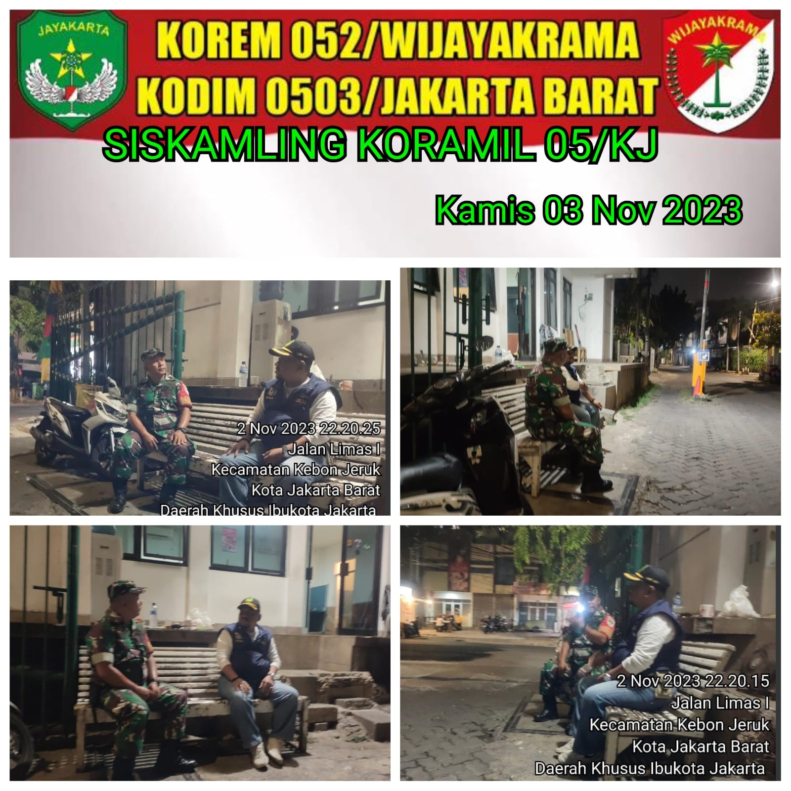 Guna memastikan situasi dan kondisi wilayah binaan aman dan kondusif, Babinsa Koramil 05/KJ Kodim 0503/JB Peltu Abdul Kadir melaksanakan patroli sambang Siskamling dengan Rahmat dan rekannya yang sedang melaksanakan jaga malam di Pos Keamanan Perumahan Taman Kedoya Permai Jln Limas I RT 007 RW 07 Kel Kebon Jeruk Kec Kebon Jeruk Jakarta Barat.