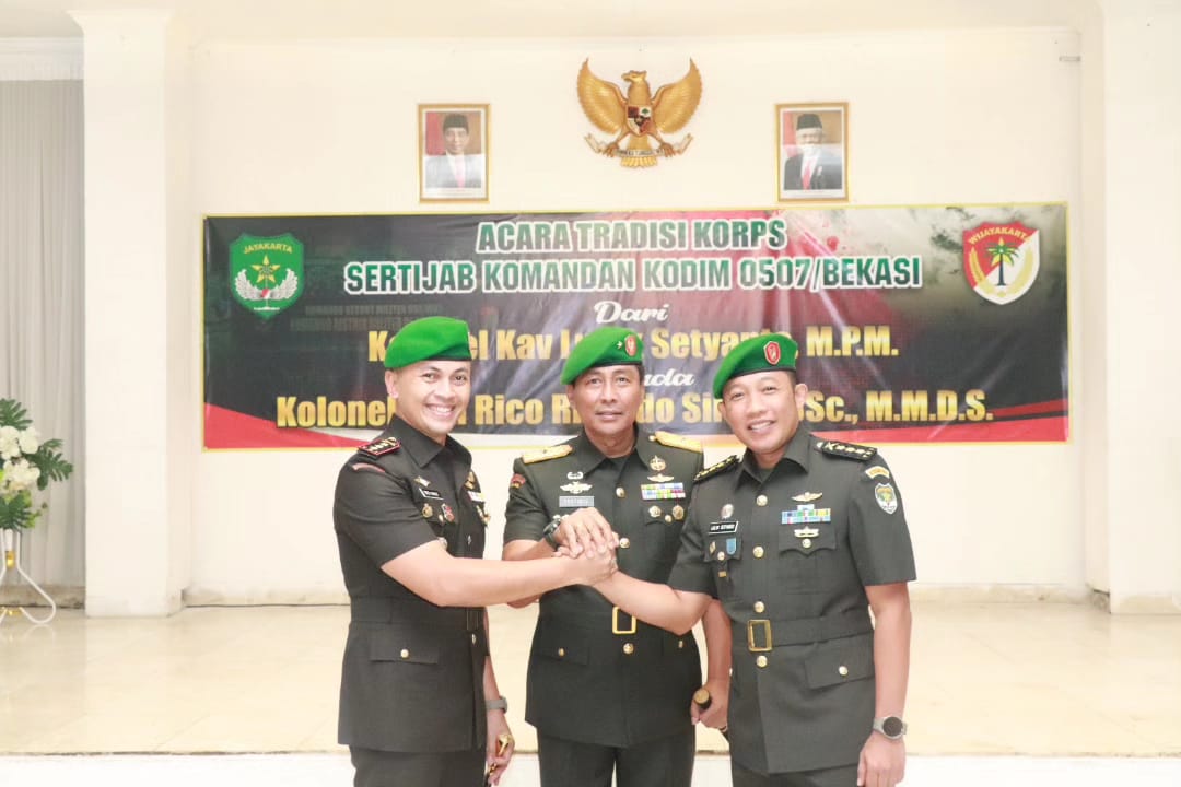 DetikSR.id Bekasi -Komandan Korem 051/Wkt Brigjen TNI Yustinus Nono Yulianto, S.E., M.Si., memimpin acara serah terima jabatan Dandim 0507/Bekasi dari Kolonel Kav Luluk Setyanto, M.P. M., kepada Kolonel Arm Rico Ricardo Sirait, BSc., M.M.D.S., bertempat di Aula Wijayakarta Makorem 051/Wkt, Jl Niaga Raya Kav 1 Jababeka Cikarang Baru Bekasi, Kamis (13/7/2023).