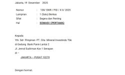 Somasi tersebut tertuang dalam surat bernomor 138/SWR/PID/XII/2025, tertanggal 19 Desember 2025, bersifat segera dan penting, dan ditujukan kepada pimpinan PT Cita Mineral Investindo Tbk yang berkantor di Gedung Bank Panin Lantai 2, Jalan Jenderal Sudirman Kav. 1, Senayan, Jakarta Pusat.