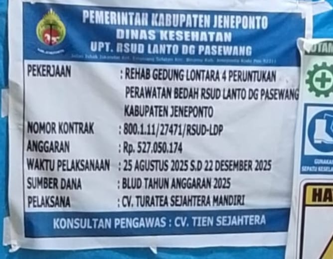 Berdasarkan informasi yang dihimpun, salah satu kegiatan proyek yang tengah berjalan yakni rehab Gedung Lontara 3 dan dll yang ada papan anggaran bersumber dari dana BLUD tahun anggaran 2025, dengan CV. Trinada Mandiri sebagai kontraktor pelaksana dan CV. Tien Sejahtera sebagai konsultan pengawas. Waktu pelaksanaan proyek ini tercatat selama 120 hari kalender.
