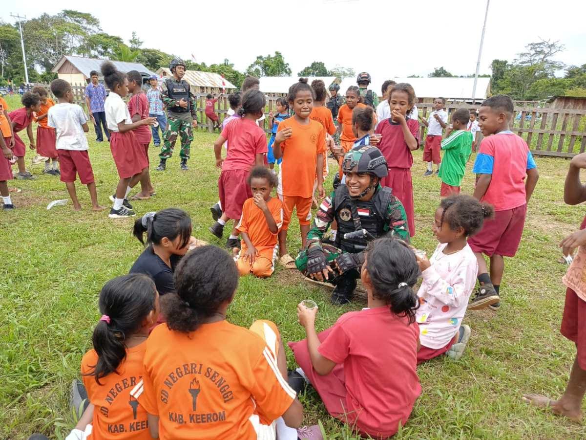 DetikSR.id Keerom ~ Ciptakan waktu yang berkualitas dengan memberikan keceriaan dan kebahagiaan bagi anak-anak di perbatasan RI-PNG, Pos Senggi Satgas Yonif 310/KK gelar Fun Game kepada siswa-siswi SDN 1 Senggi di Distrik Senggi, Kabupaten Keerom, Papua, Rabu (8/5/2024).