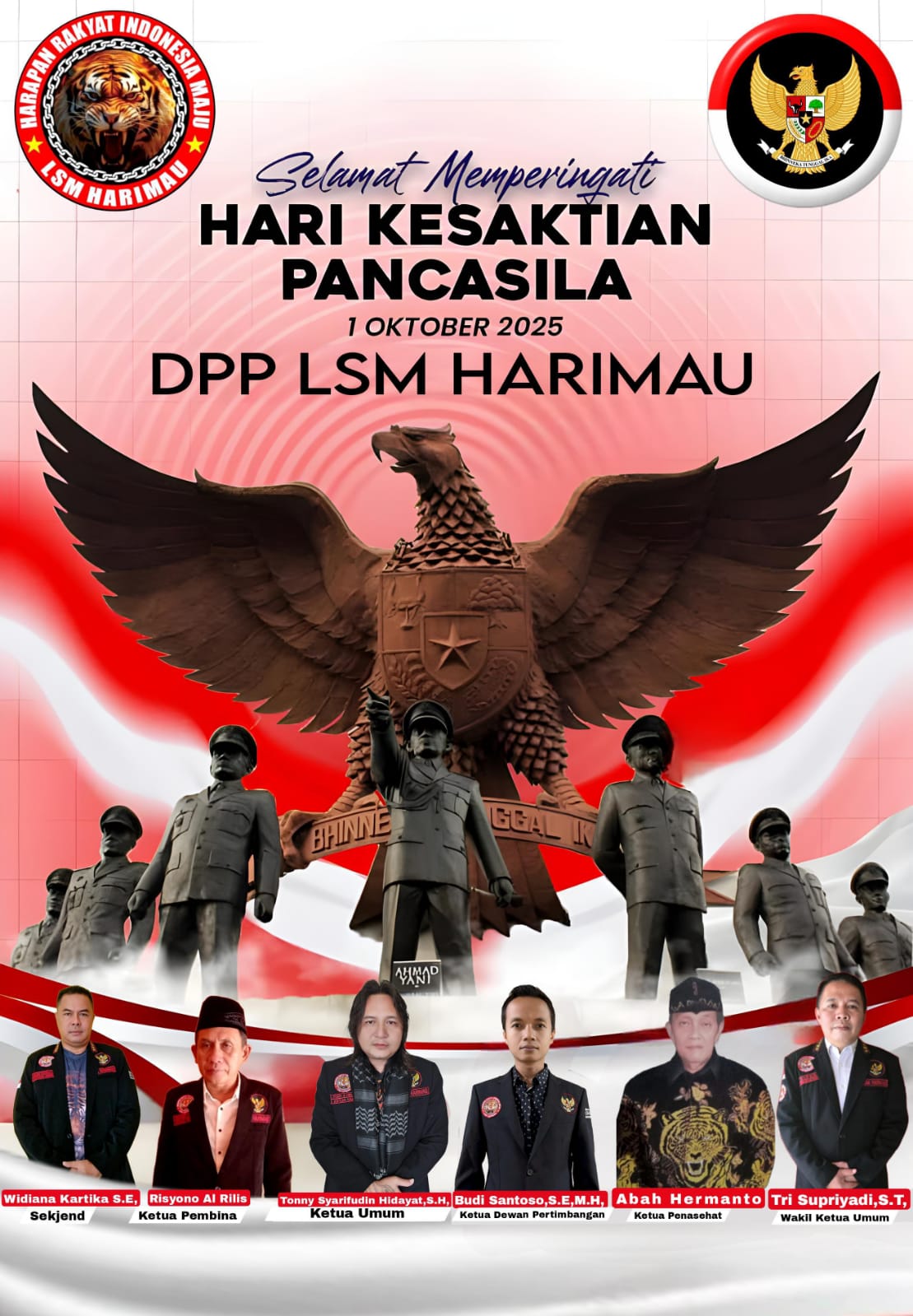 DetikSR.id Jakarta, 1 Oktober 2025 – Pancasila bukan sekadar dasar negara, melainkan ruh pemersatu bangsa Indonesia. Memperingati Hari Kesaktian Pancasila, Dewan Pimpinan Pusat (DPP) LSM HARIMAU menyerukan kepada seluruh rakyat Indonesia untuk meneguhkan kembali semangat kebangsaan, menjaga persatuan, serta melawan segala bentuk ancaman yang dapat merusak keutuhan NKRI.