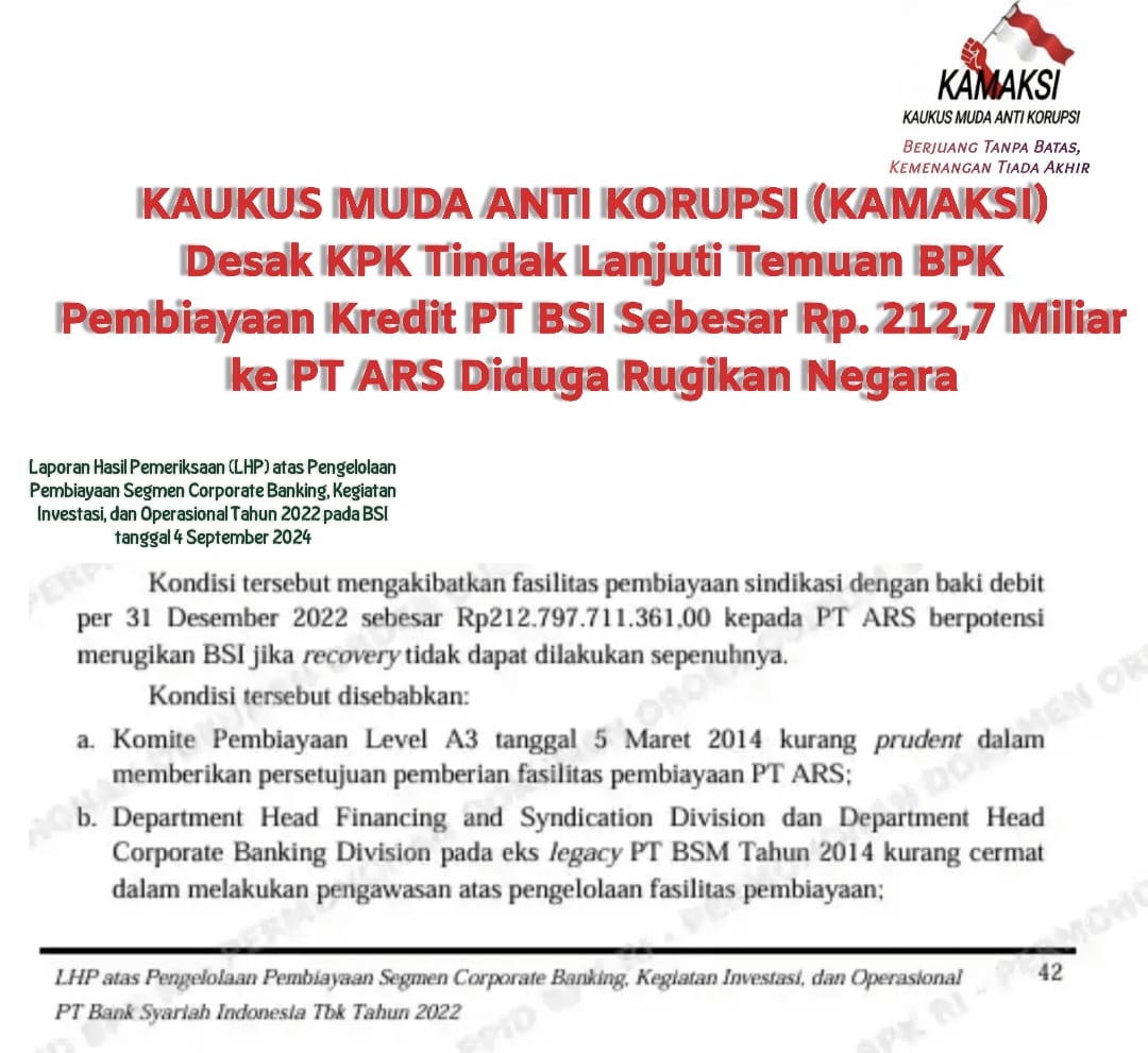 KAMAKSI mendesak Lembaga Anti Rasuah yaitu Komisi Pemberantasan Korupsi (KPK) segera menindak lanjuti hasil LHP BPK atas pembiayaan PT BSI kepada PT ARS sebesar Rp212.797.711.361,00 yang diduga berpotensi merugikan Negara. Jumlah yang sangat fantastis, KAMAKSI mendukung BPK, KPK dan Kejaksaan Agung membentuk tim audit investigasi khusus untuk segera memanggil dan memeriksa Direksi PT BSI agar dugaan kerugian uang Negara dalam pemberian kredit tersebut diusut tuntas terang benderang ke publik,” tegas Joko Priyoski Ketua Umum DPP KAMAKSI.