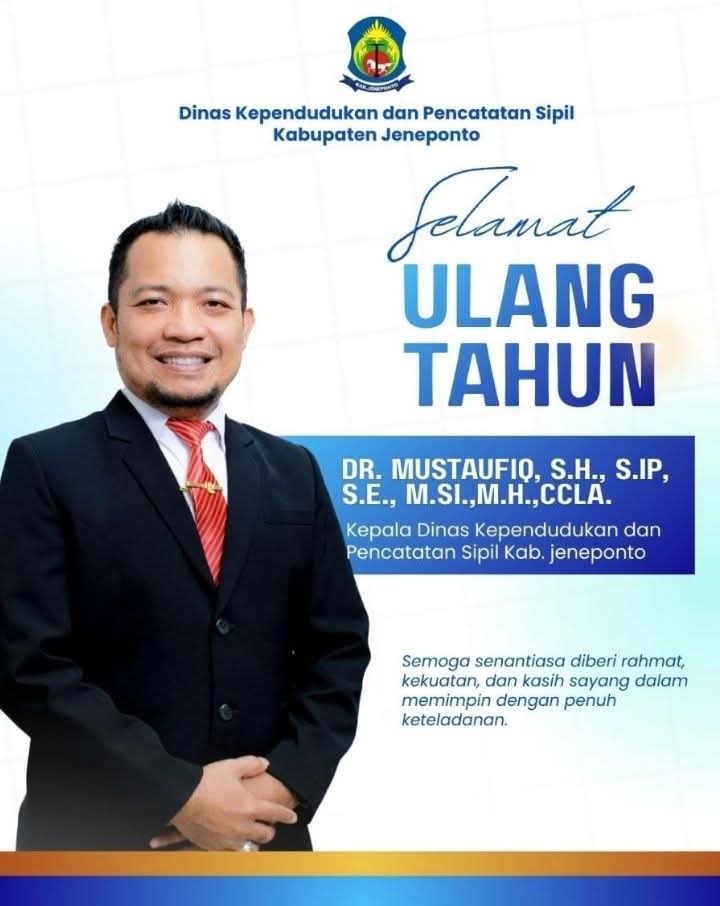 Ucapan tersebut disampaikan sebagai bentuk apresiasi dan penghormatan atas dedikasi serta pengabdian Dr. Mustaufiq dalam memimpin Disdukcapil Jeneponto, khususnya dalam meningkatkan kualitas pelayanan administrasi kependudukan yang humanis, profesional, dan berorientasi pada kepuasan masyarakat.