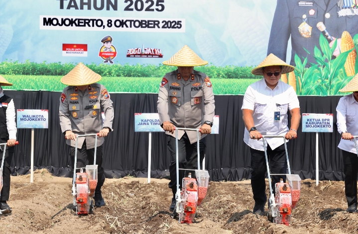 Kapolda Jawa Timur,Irjen Pol Drs.Nanang Avianto,M.Si memimpin langsung kegiatan penanaman Jagung serentak Kuartal IV tahun 2025 di Desa Pacing, Kecamatan Bangsal, Kabupaten Mojokerto, Rabu (8/10/2025).
