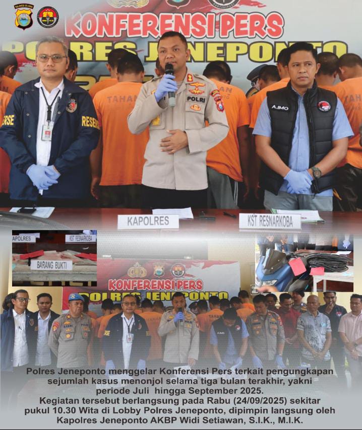 DetikSR.id Jeneponto – Kepolisian Resor (Polres) Jeneponto menggelar jumpa pers pada Kamis, 24 September 2025, di tribun Polres Jeneponto. Dalam kesempatan itu, Kapolres Jeneponto memaparkan pengungkapan dua kasus tindak kriminal yang meresahkan masyarakat, yakni pencurian kabel Telkomsel dan kasus pelemparan kendaraan bermotor.