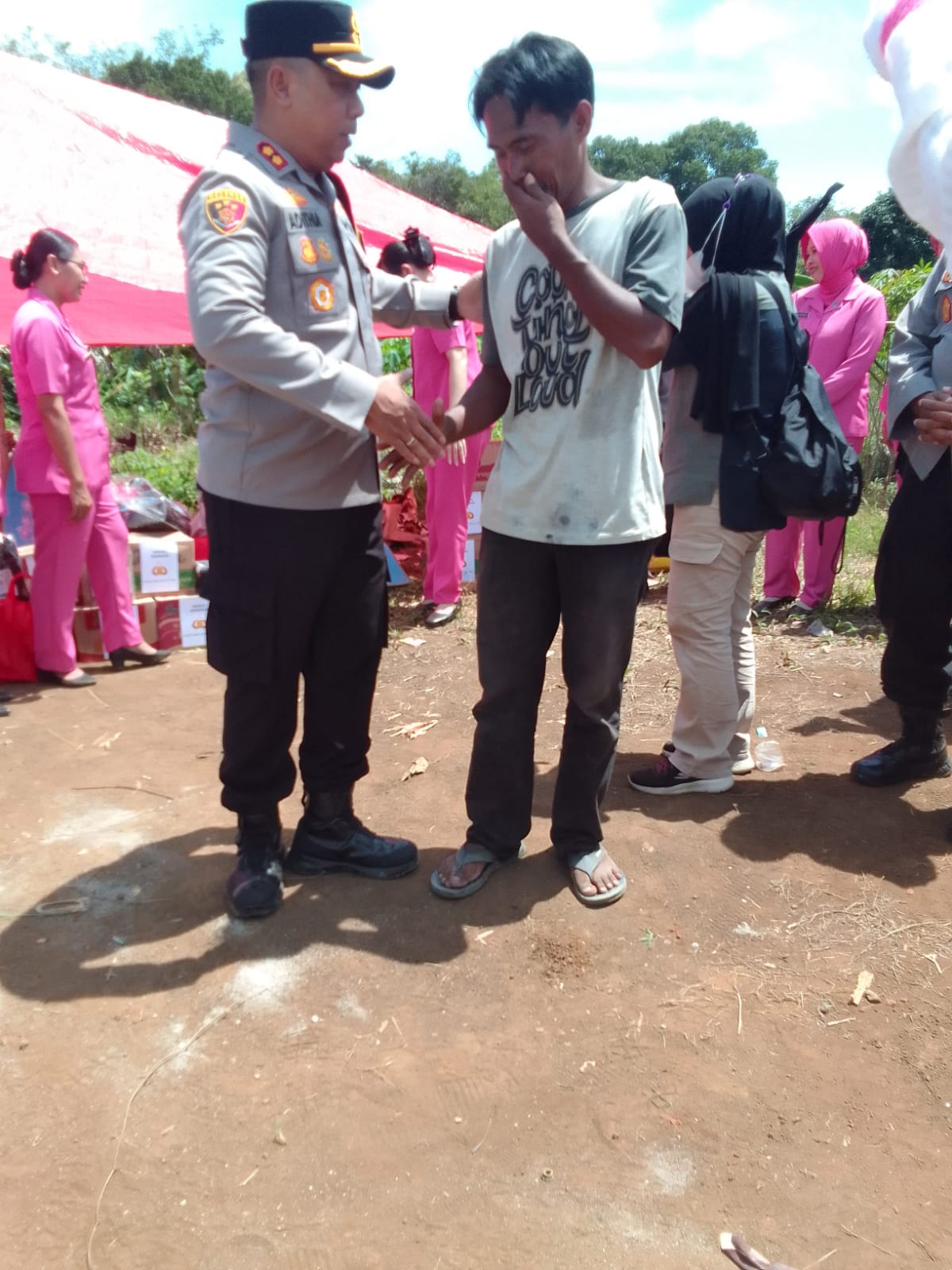 Kapolres bersama rombongan memberikan dukungan moral serta bantuan tali asih kepada korban keganasan hempasan angin laysus yakni Asep rumahnya rata dengan tanah hanya tersisa sebagian bagian kamar tidur itu.