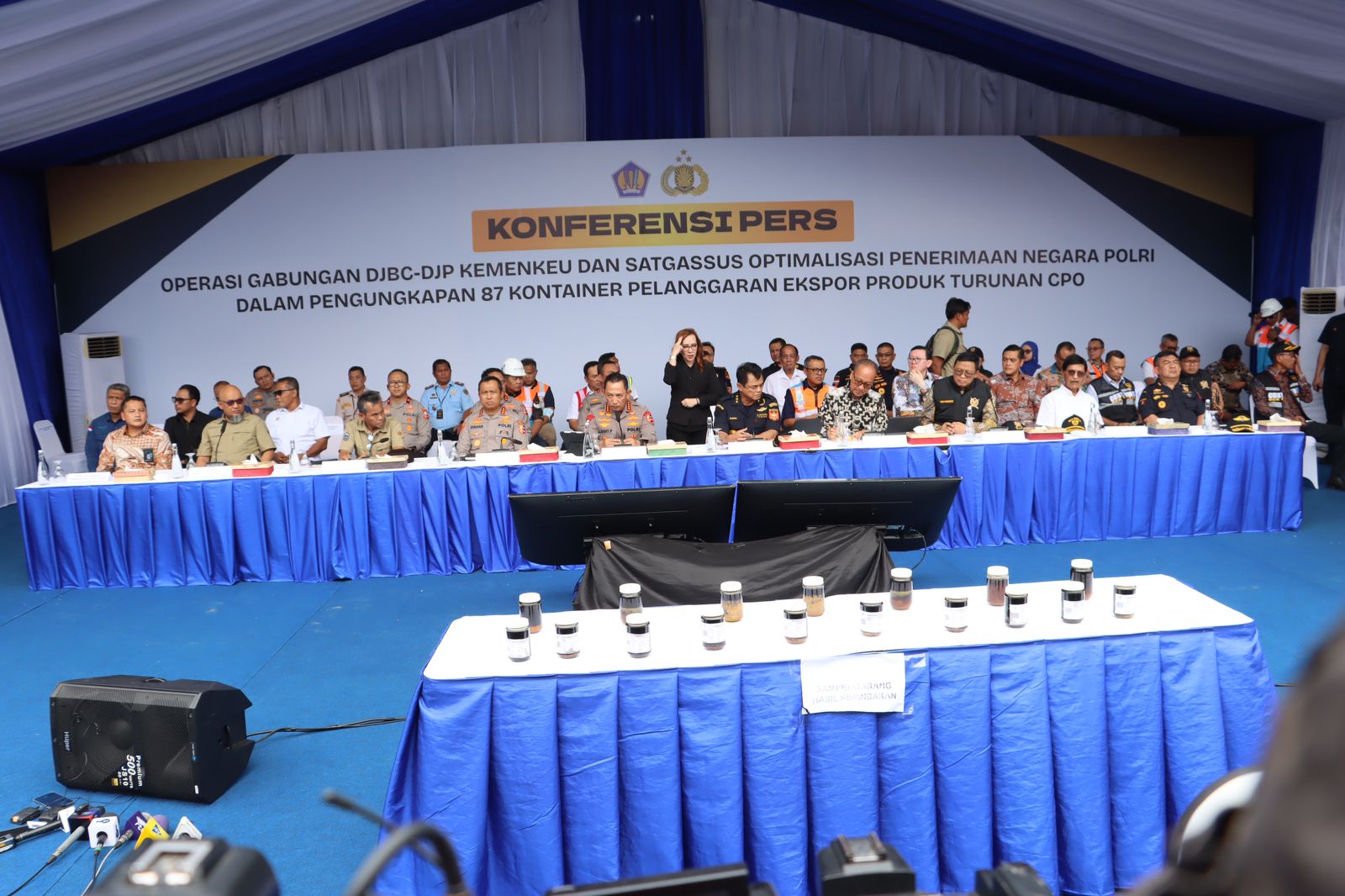 DetikSR.id Jakarta – Kapolres Pelabuhan Tanjung Priok AKBP Dr. Martuasah H. Tobing, S.I.K., M.H., memimpin Pengamanan Konferensi Pers, Kepolisian Negara Republik Indonesia bersama Kementerian Keuangan terkait pengungkapan kasus ekspor ilegal produk turunan Crude Palm Oil (CPO) di Buffer Area NPCT 1, Kalibaru, Jakarta Utara. Sebanyak 87 kontainer berisi produk turunan sawit dengan nilai kerugian negara mencapai Rp2,8 triliun berhasil diamankan dalam operasi bersama ini.