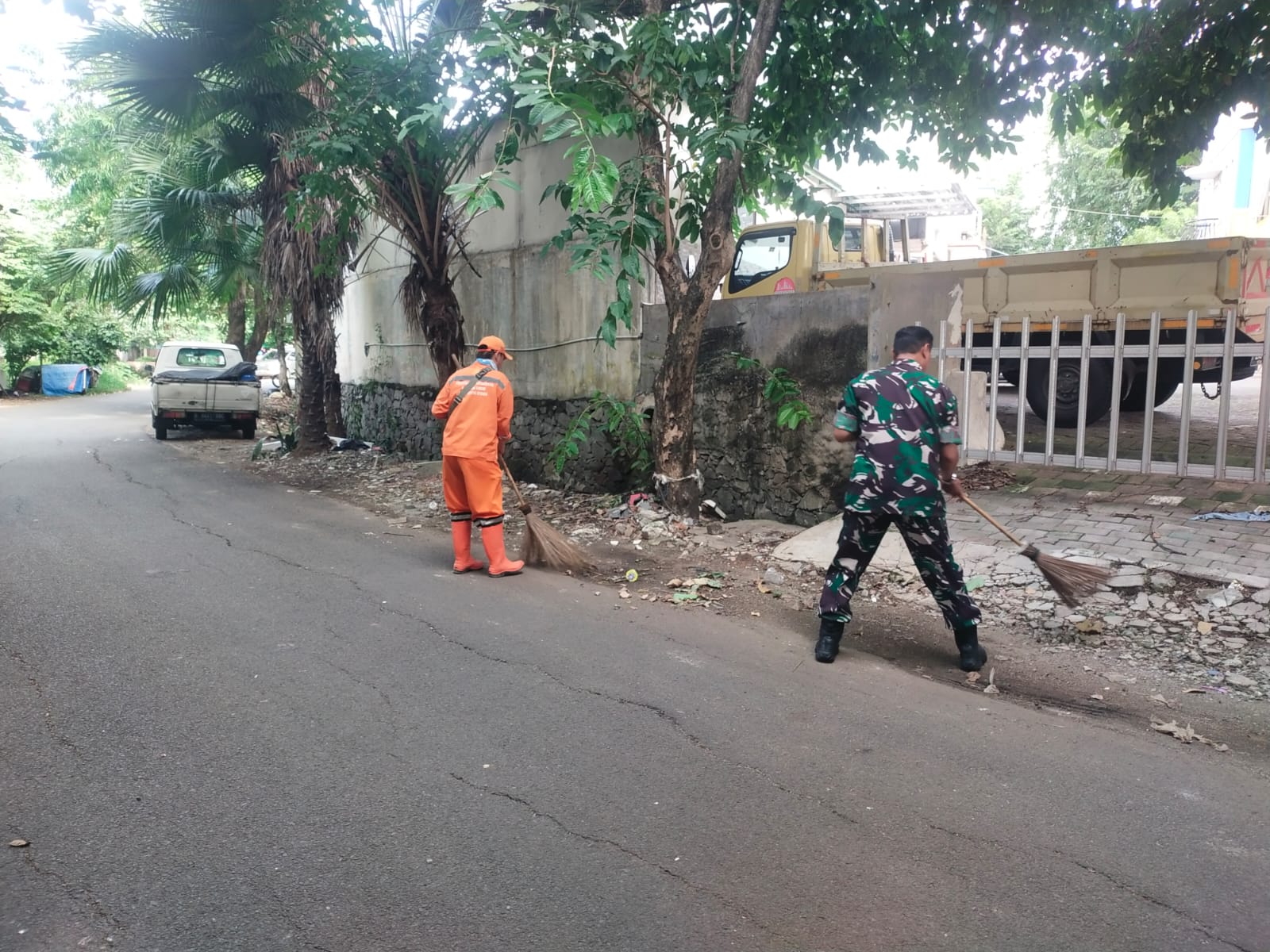 Babinsa Peltu Arief W hadir dan memimpin langsung kegiatan tersebut. Bersama dengan PPSU Kelurahan Meruya Utara, mereka bergotong royong membersihkan sampah di area jalan umum.