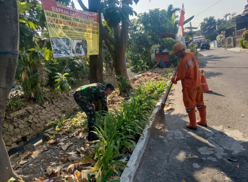 Dengan semangat gotong royong, Sertu Agus Toni bersama PPSU saling bahu-membahu membersihkan sampah dan memangkas pohon yang menghalangi pandangan pengendara.