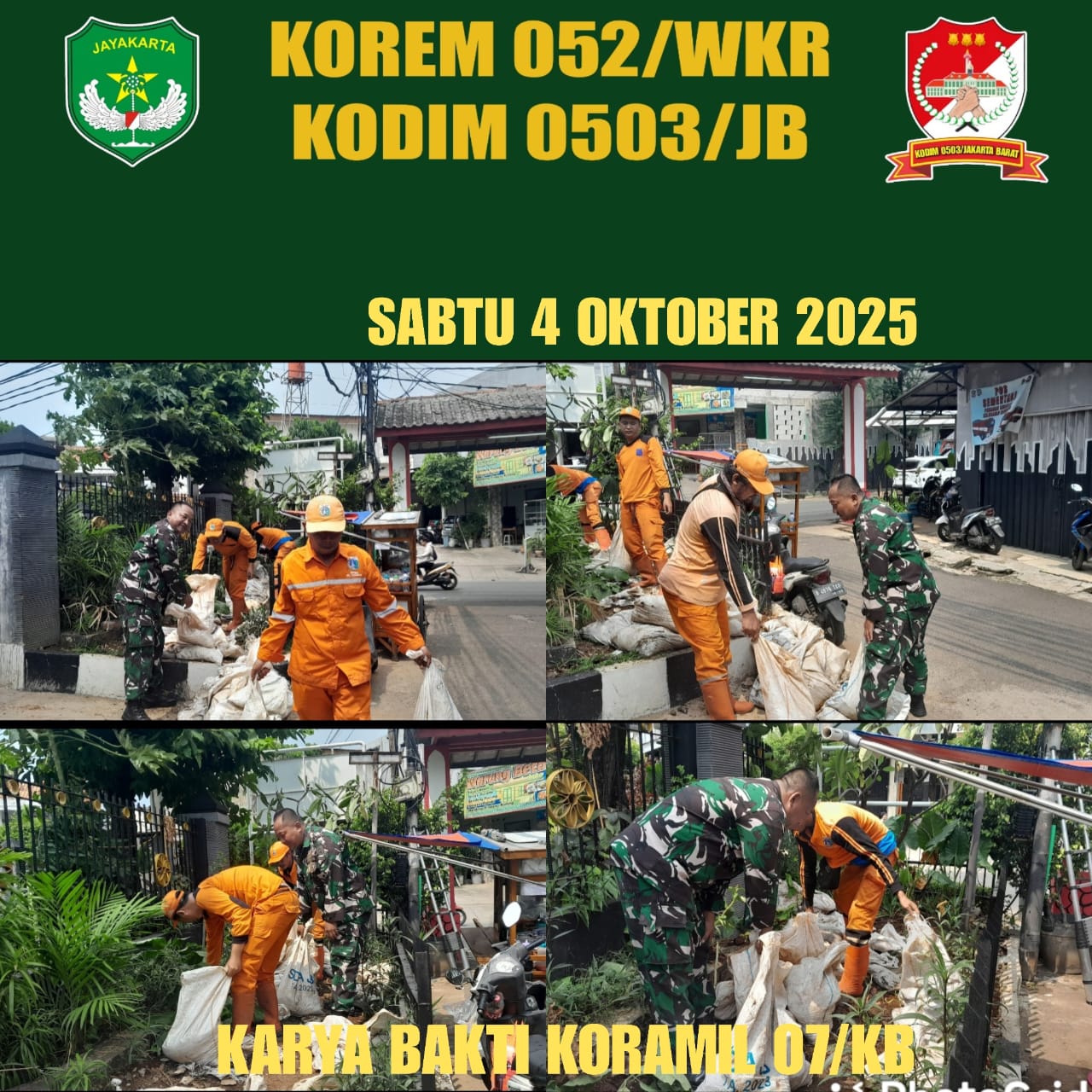 Koramil 07/KB melalui Babinsa Sertu Heru, bersama dengan petugas PPSU Kelurahan Srengseng, fokus membersihkan sampah yang berserakan di jalan umum.