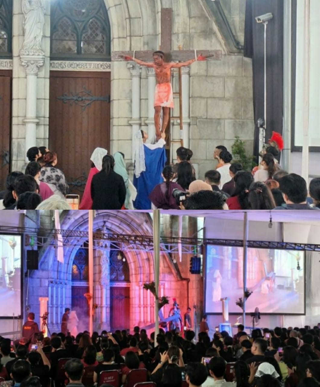 Ibadat Jumat Agung dilaksanakan setelah prosesi Jalan Salib yang diadakan sebanyak tiga kali, yaitu pukul 12.00 WIB, 15.00 WIB, dan 18.00 WIB. Seluruh rangkaian ibadah ini diselenggarakan secara hibrida, memadukan kehadiran langsung dan siaran daring.