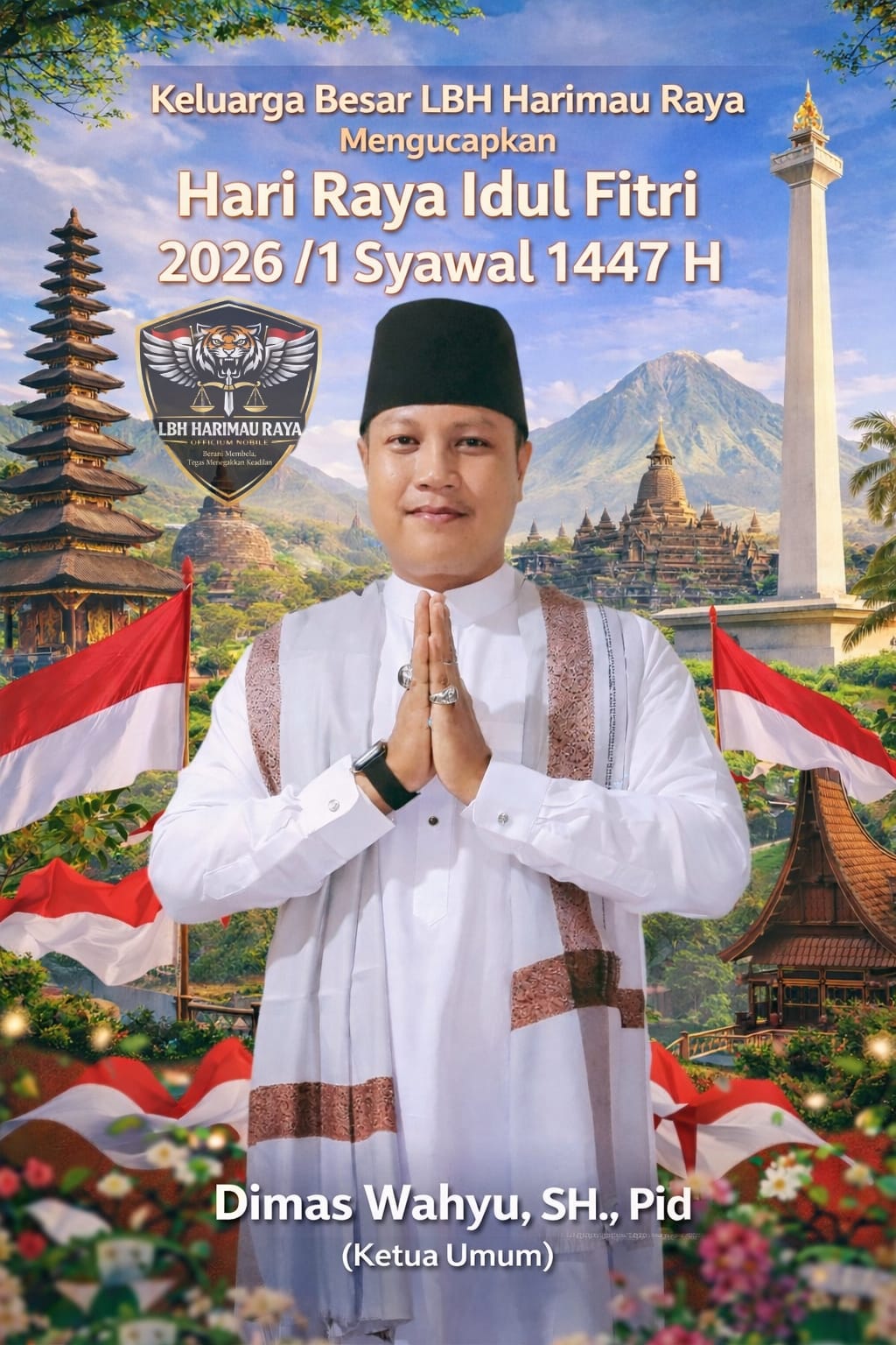 Dalam momentum yang penuh berkah ini, Ketua Umum Lembaga Bantuan Hukum (LBH) Harimau Raya, Dimas Wahyu, S.H., Pid., yang akrab disapa Bang Rangga, menyampaikan ucapan Selamat Hari Raya Idul Fitri 1 Syawal 1447 H kepada seluruh umat Islam di Indonesia.