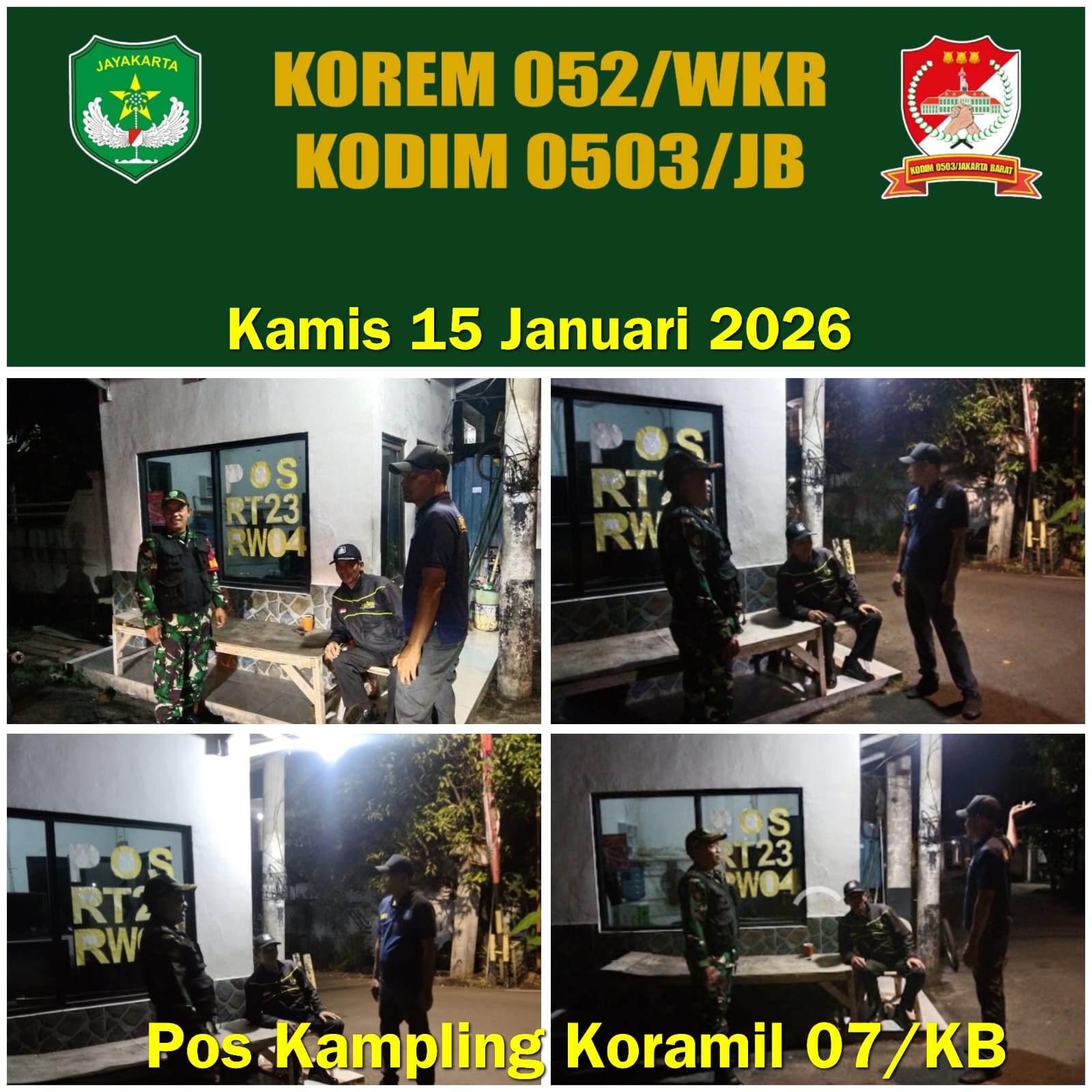 DetikSR.id Kodam Jaya Jakarta – Babinsa Koramil 07/Kembangan Sertu Syawal melaksanakan Monitoring  Siskamling PAM Swakarsa dan sambang dialogis dengan anggota keamanan Ruli dan Tono di Jl. Penyelesaian Tomang ll Rt 23/04 Kel Meruya Selatan Kec Kembangan Jakarta Barat. Kamis malam 15 Januari 2026