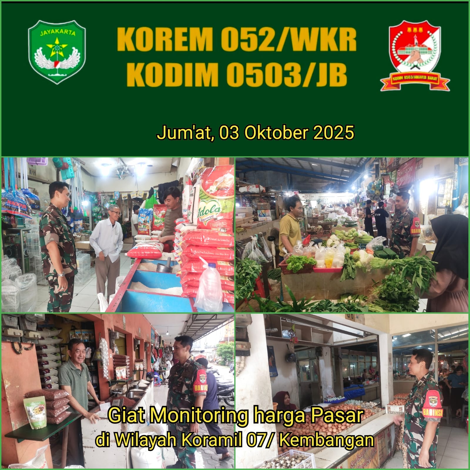 DetikSR.id Kodam Jaya Jakarta – Sebagai langkah antisipasi terhadap potensi lonjakan harga, Babinsa Koramil 07/KB Kodim 0503/JB, Peltu Arief W, melaksanakan pemantauan dan pengecekan harga bahan pokok di Pasar Lokbin Meruya Utara, yang terletak di Jalan Meruya Ilir RT 18/04, Kelurahan Meruya Utara, Kecamatan Kembangan, Jakarta Barat.