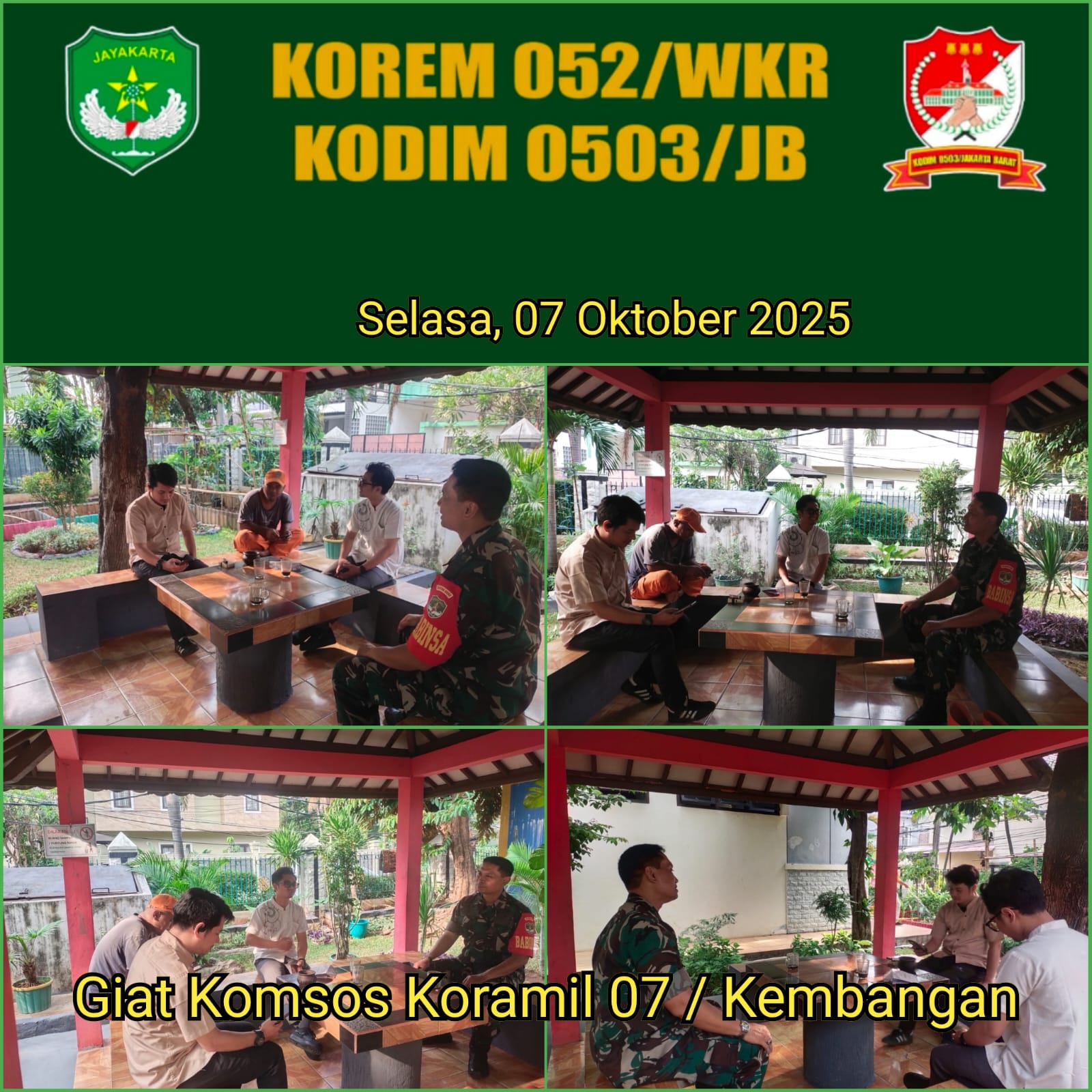 DetikSR.id Kodam Jaya Jakarta – Dalam rangka menjalin komunikasi dan mempererat kedekatan dengan warga di wilayah binaan, Babinsa Kelurahan Meruya Utara, Peltu Arief W, melaksanakan Komunikasi Sosial (Komsos) bersama PJLP Bapak Roby dan anggota PPSU di Saung kantor kelurahan, Jl. Aries Raya Blok C6 No. 1 RT. 02/06, Kelurahan Meruya Utara, Kecamatan Kembangan, Jakarta Barat, pada hari Selasa, 7 Oktober 2025.