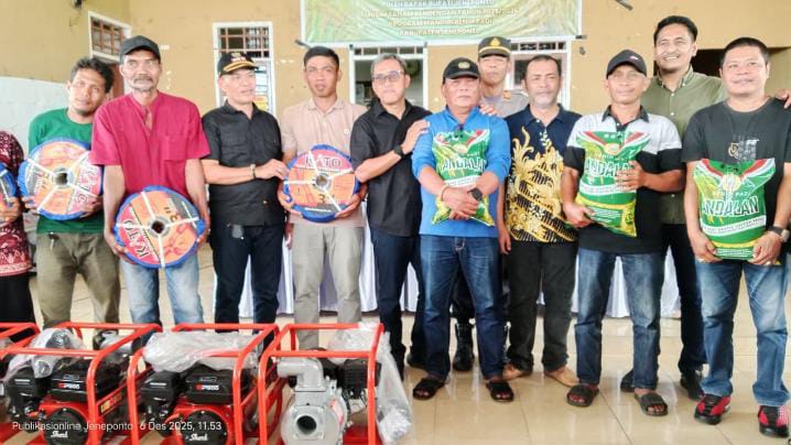 Penyerahan bantuan benih padi dan alsintan dilakukan secara simbolis oleh Bupati Jeneponto, H. Paris Yasir, didampingi oleh Plt. Kepala Dinas Pertanian, Bambang Hariyanto, di Aula Kantor Desa Kayuloe Timur, Kecamatan Turatea, Kabupaten Jeneponto, pada Sabtu, 6 Desember 2025.