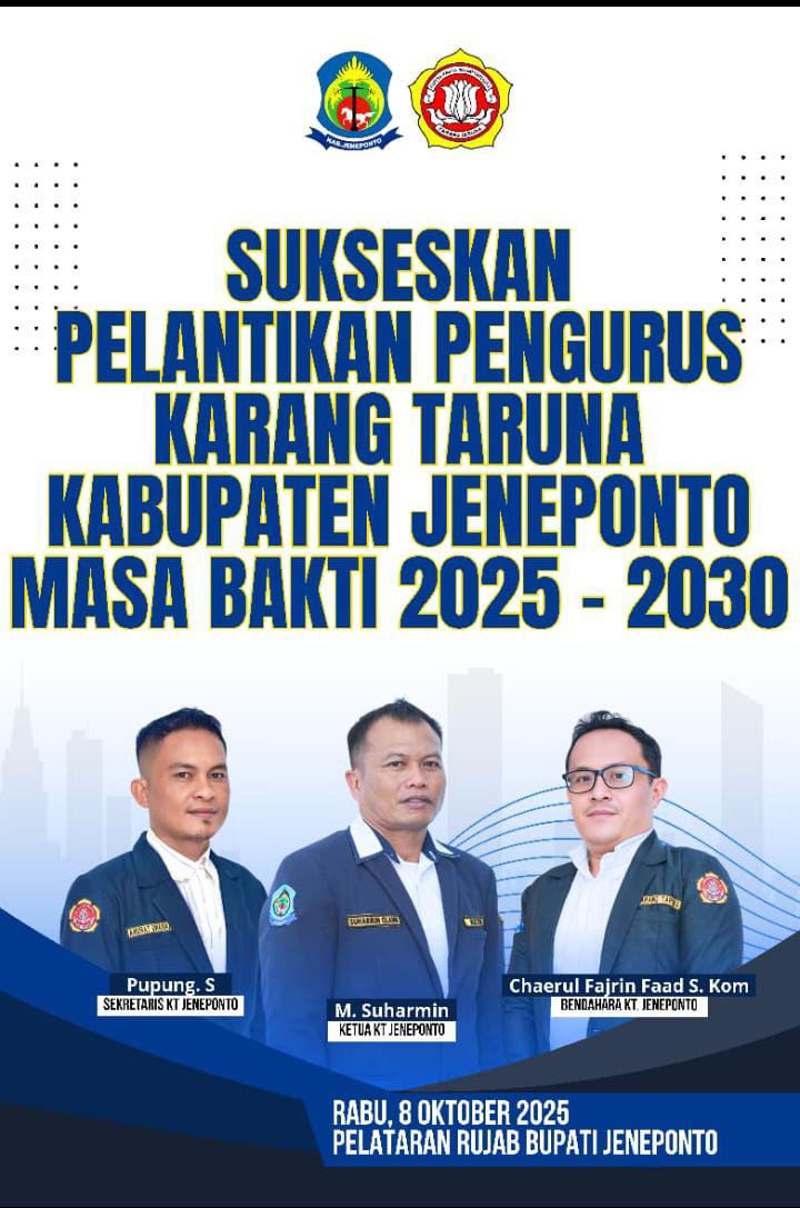 Kegiatan tersebut menjadi momentum penting bagi Karang Taruna Jeneponto dalam memperkuat peran sosial dan kepemudaan di tengah masyarakat. Acara pelantikan ini akan dihadiri oleh seluruh instansi Pemerintah Kabupaten Jeneponto, Karang Taruna Provinsi Sulawesi Selatan, serta perwakilan Karang Taruna dari berbagai kabupaten sekitar, seperti Bulukumba dan wilayah tetangga lainnya.