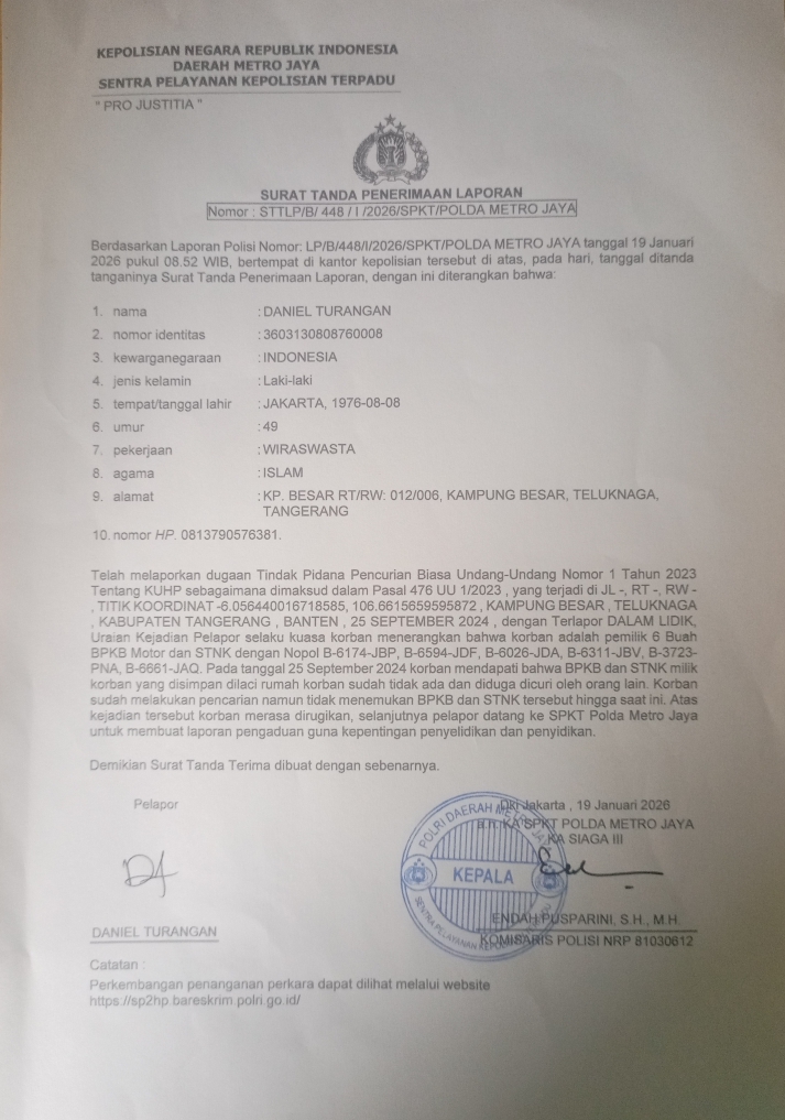 DetikSR.id Tangerang – Banten, Pencurian 6 BPKB dan STNK yang terjadi di dealer Hasan Motor yang beralamat di RT. 003/05, Desa. Kp. Besar, kec. Teluknaga, Kab. Banten pada tanggal 25 September 2024.