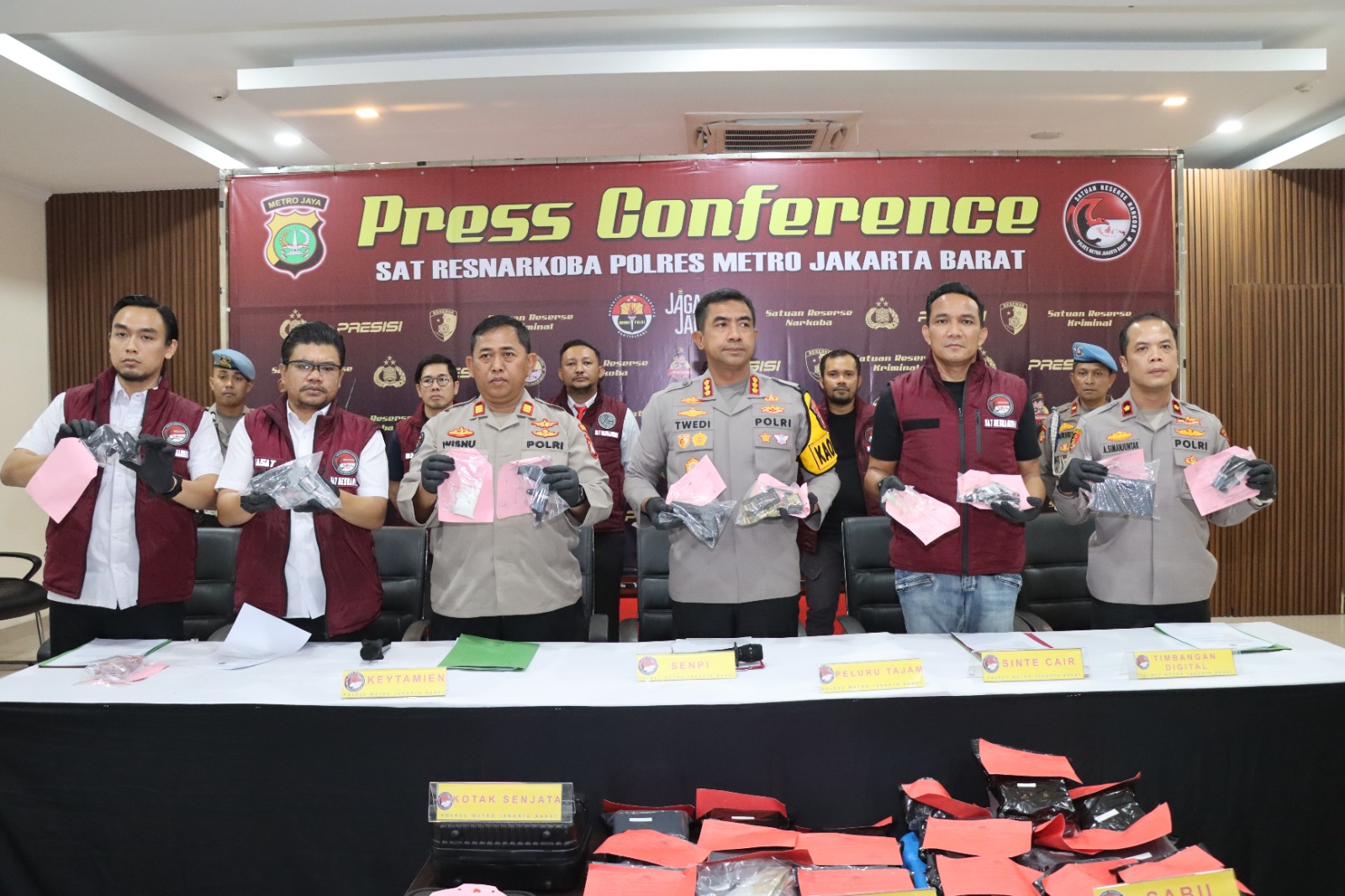 “Tersangka membeli, memiliki, menyimpan, membawa, menerima, menguasai, dan mengonsumsi narkotika jenis sabu, ekstasi, ketamin, serta kanabinoid sintetis cair,” ujar Twedi saat konferensi pers di Polres Metro Jakarta Barat, Selasa (2/12/2025).
