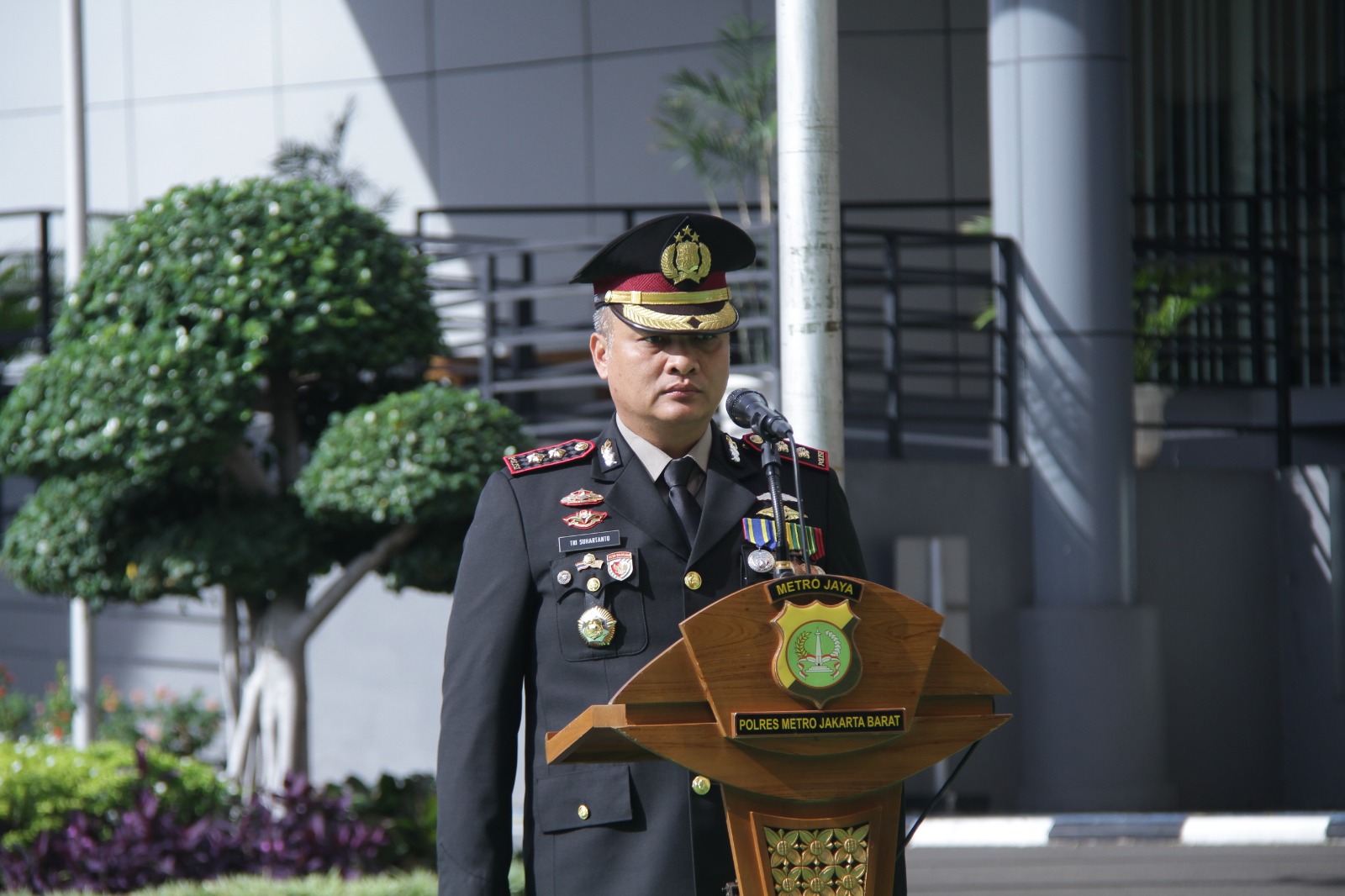 Kapolres Metro Jakarta Barat Kombes Pol Twedi Aditya Bennyahdi, S.Sos., S.I.K., M.H. melaksanakan upacara di Kantor Wali Kota Jakarta Barat, sementara di halaman Polres Metro Jakarta Barat upacara dipimpin oleh Wakapolres Metro Jakarta Barat, AKBP Dr. Tri Suhartanto, S.H., M.H., M.Si., yang bertindak sebagai inspektur upacara.