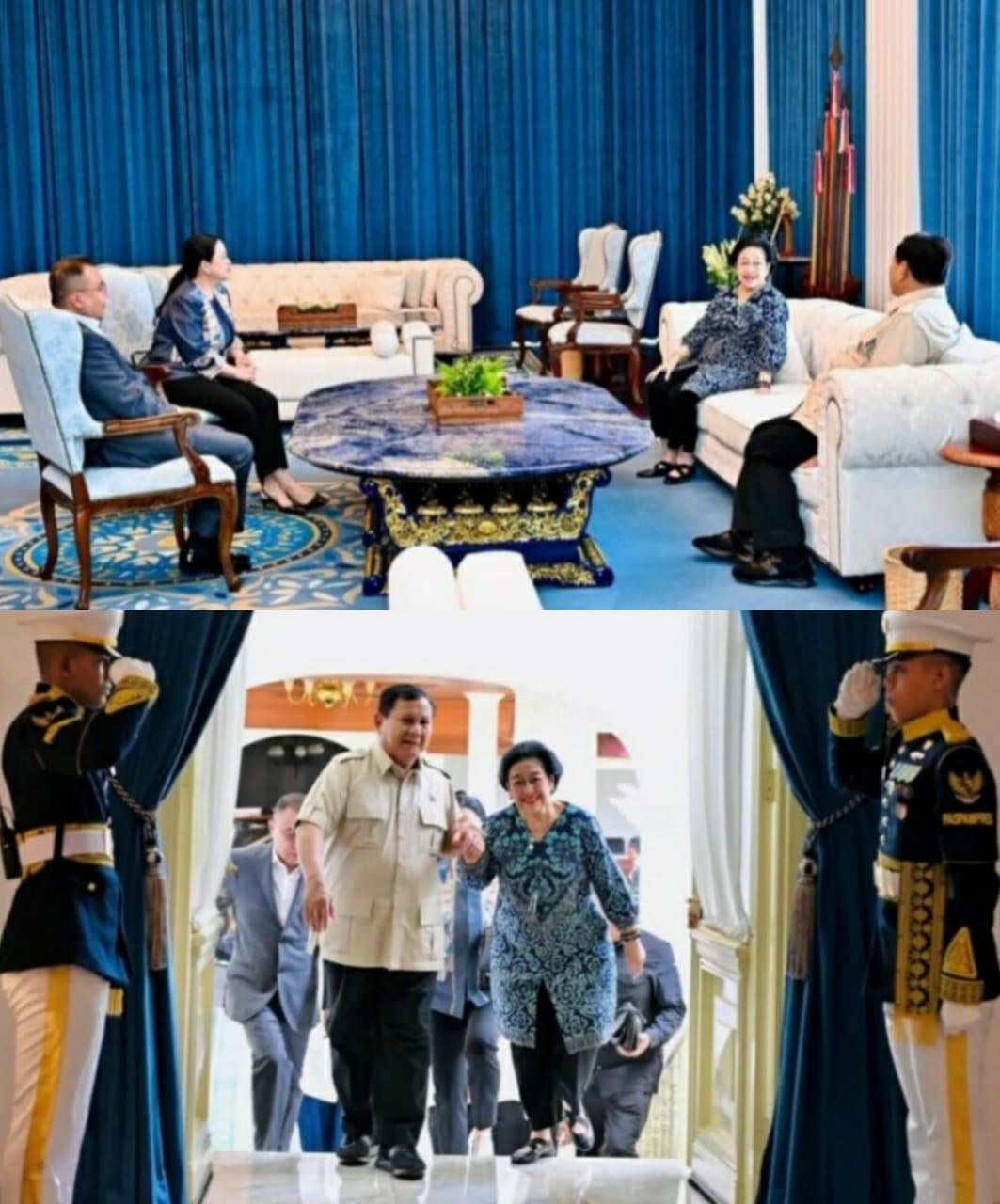 Dalam momen tersebut, Presiden tampak menuntun Megawati saat memasuki area dalam istana, mencerminkan sikap hormat serta kedekatan personal yang terjalin di antara keduanya.