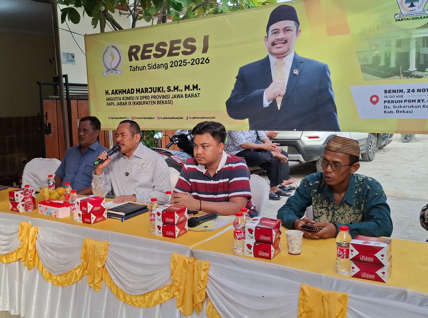 DETIKSR.id Bekasi — Dalam rangka menjalankan tugasnya sebagai wakil rakyat, Anggota DPRD Provinsi Jawa Barat Komisi IV Dapil Jabar IX Fraksi Partai Golkar, H. Akhmad Marjuki, SM.MM, menggelar kegiatan Reses I di Desa Sukarukun, Kecamatan Sukatani, Kabupaten Bekasi, pada Senin (24/11).