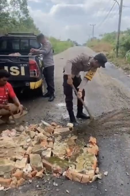 “Benar, personel Polsek BTS Ulu Polres Musi Rawas melakukan pengecekan kondisi jalan sekaligus perbaikan sementara dengan cara menimbun lubang jalan menggunakan batu sebagai upaya antisipasi terjadinya kecelakaan,” ujar Kapolsek.