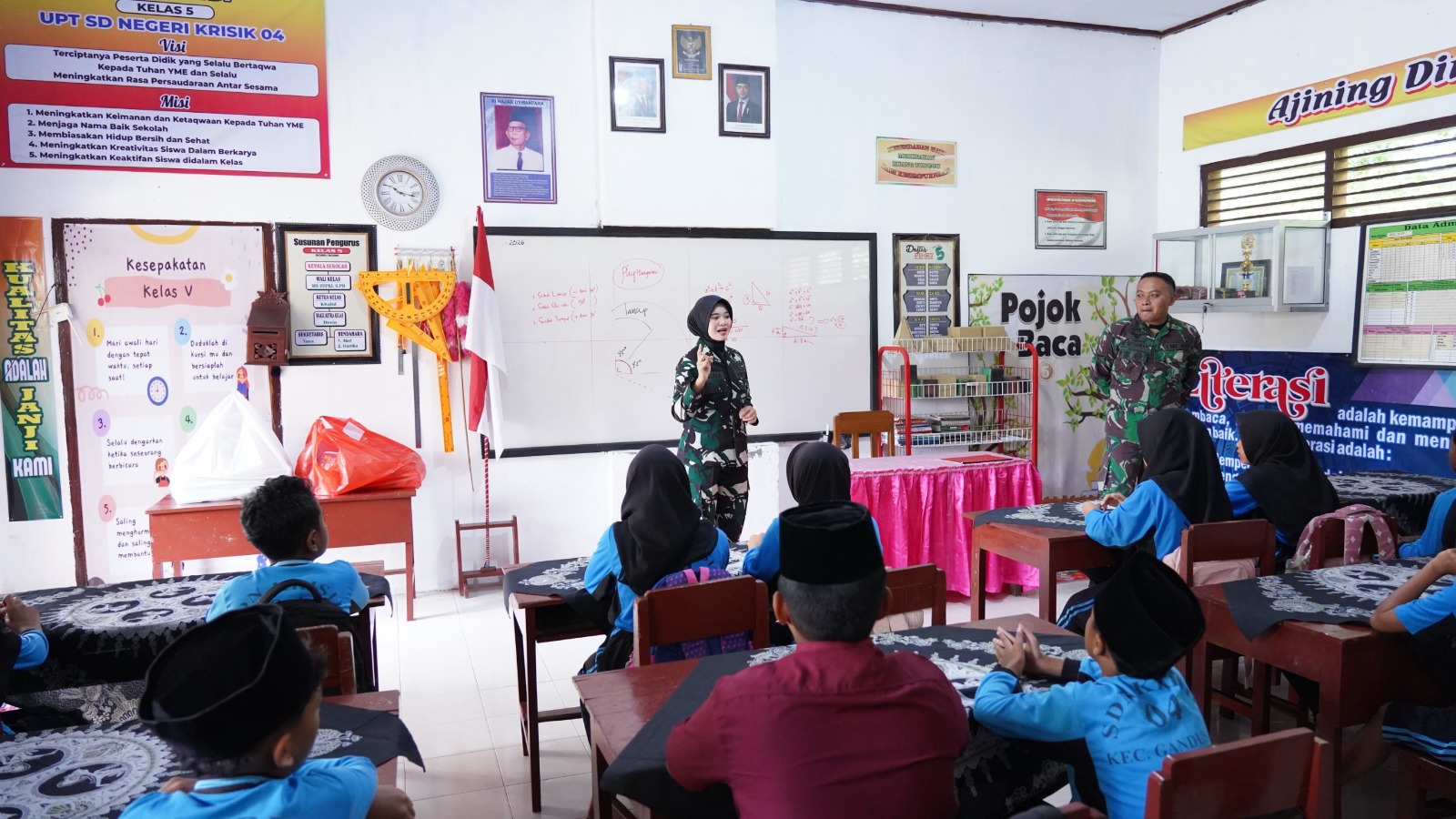 Sertu (K) Mira salah satu personel Satgas TMMD ke 127 Kodim 0808/Blitar, terlihat mengambil peran sebagai guru dengan berinteraksi langsung dengan para pelajar di ruang kelas UPT SD Negeri 4 Krisik, Selasa (24/02/2026)