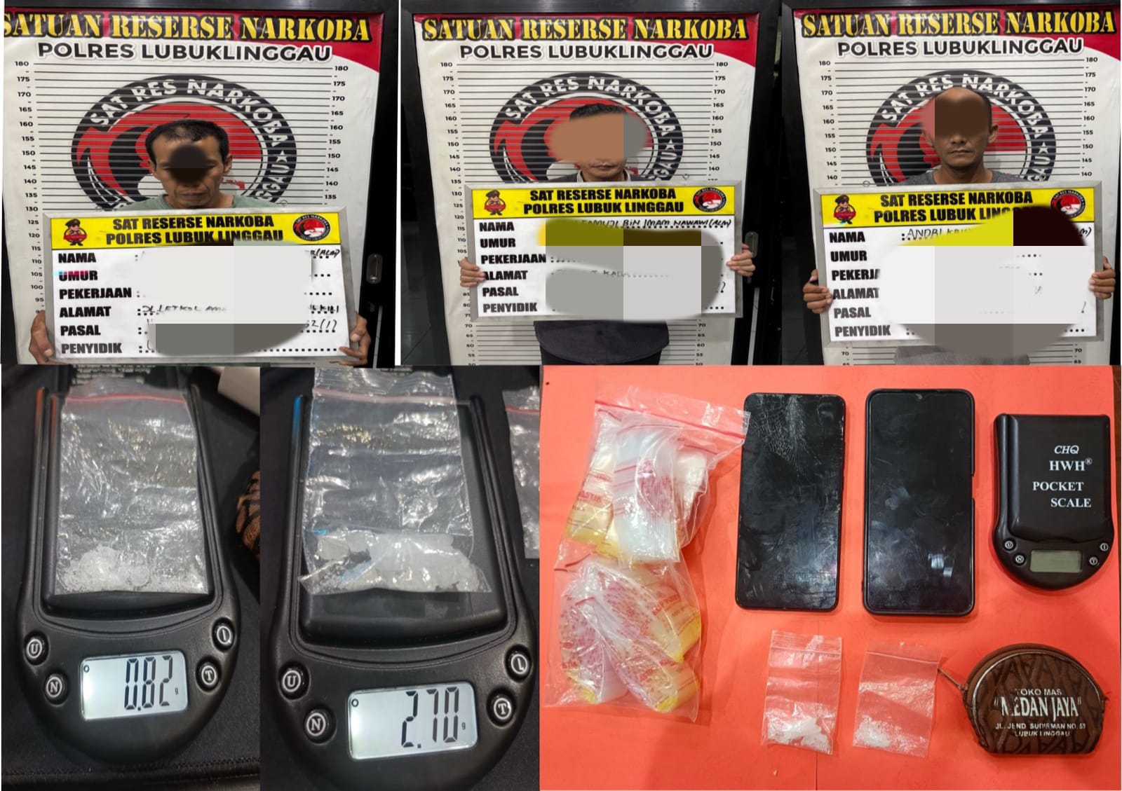Kali ini, petugas berhasil mengamankan tiga pelaku yang terlibat dalam penyalahgunaan dan peredaran narkotika jenis sabu, pada Jumat (18/10/2025). Ketiga pelaku yang diamankan masing-masing berinisial AM (50), warga Jl. Letkol Atmo RT. 006 Kelurahan Bandung Kiri, Kecamatan Lubuk Linggau Barat I, MF (50), warga Jalan Bukit Kaba RT.006 Kelurahan Dempo, Kecamatan Lubuk Linggau Timur II; dan AK (44), warga Jl. Puskesmas Taba Gg. Jariah RT.03 Kelurahan Cereme Taba, Kecamatan Lubuk Linggau Timur II.