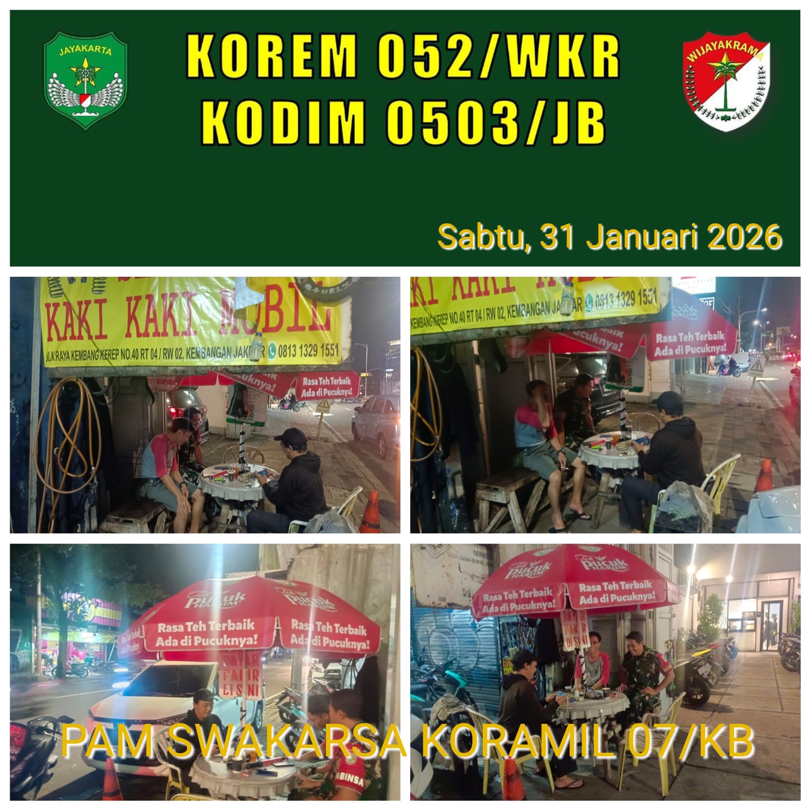 DetikSR.id Kodam Jaya Jakarta – Babinsa Koramil 07/KB Kel. Meruya Utara Sertu Agus Toni melaksanakan Siskamling/Pam Swakarsa dan sambang dialogis bersama warga di Jalan Kembang Kerep RT 05/02 Kel. Meruya Utara Kec.Kembangan Jakarta Barat. Sabtu malam 31 Januari 2026