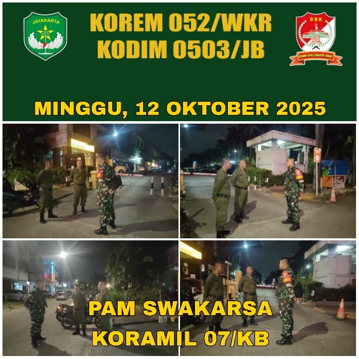 DetikSR.id Kodam Jaya Jakarta – Babinsa Koramil 07/KB Kodim 0503/JB, Kopda Niko Perdana, bersama Banser dan Wanra melaksanakan Siskamling/PAM Swakarsa. Kegiatan jaga malam ini dilaksanakan di Blok M8, RT.11/RW 7, Kelurahan Kembangan Selatan, Kecamatan Kembangan, Kota Jakarta Barat. Minggu malam 12 Oktober 2025