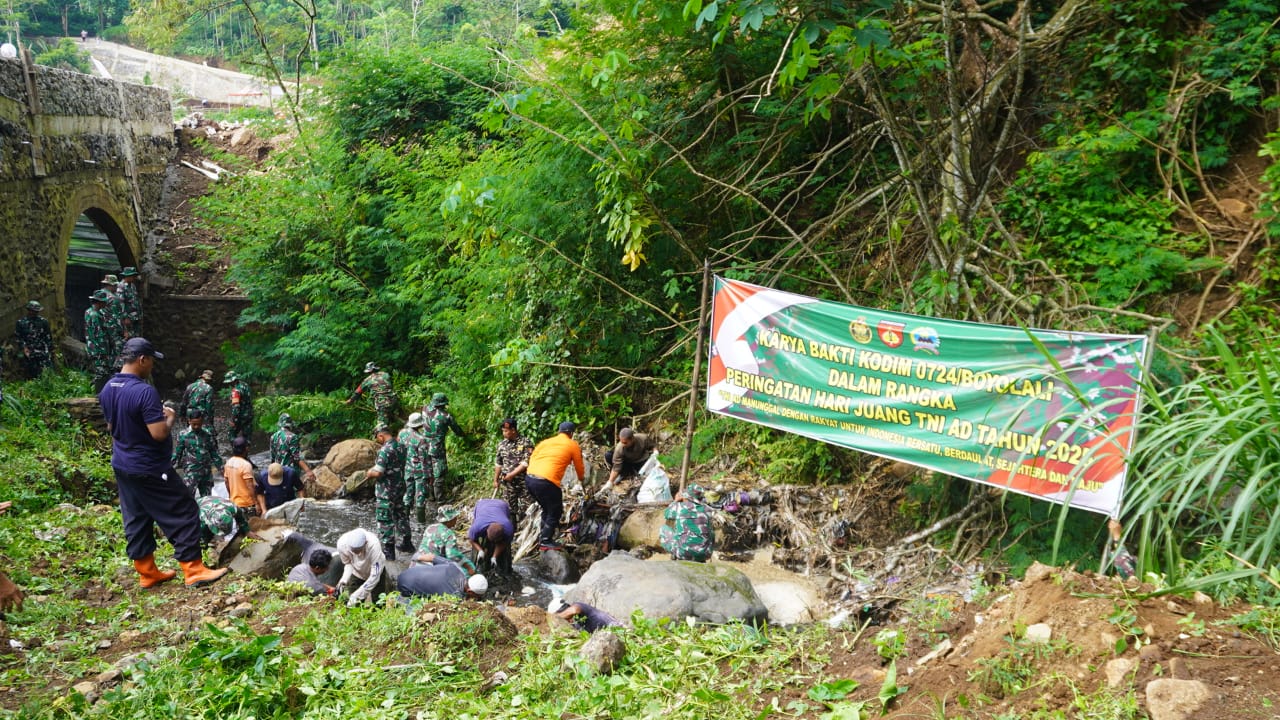 TNI AD Gelar Karya Bakti Bersihkan Sungai di Ampel Boyolali dalam Rangka Hari Juang TNI AD ke-80