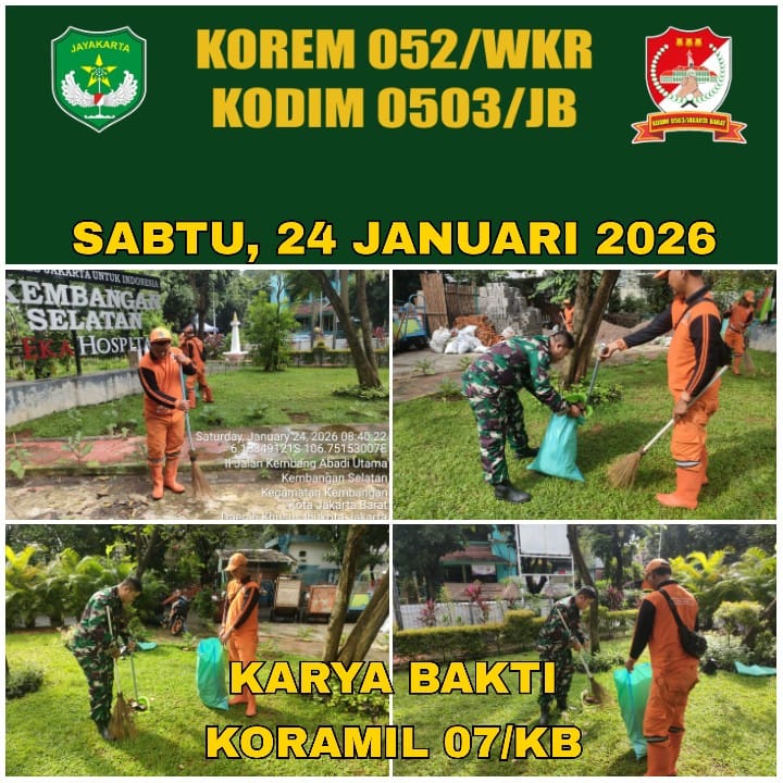 DetikSR.id Kodam Jaya Jakarta – Upaya mewujudkan lingkungan yang bersih dan sehat Babinsa Koramil 07/Kembangan Kopda Niko Perdana gelar Karya Bakti Pembersihan Lingkungan, bertempat di Jl. Taman Kembangan Abadi Utama Rt 01/008 Kel. Kembangan Selatan, Kec. Kembangan, Jakarta Barat. Sabtu 24 Januari 2026